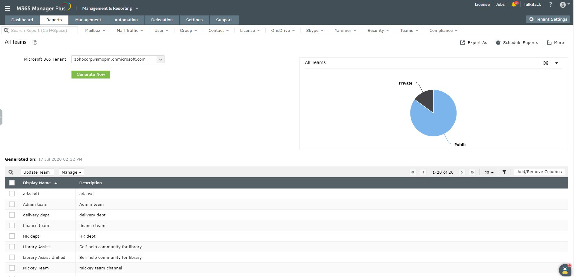 M365 Manager Plus kullanarak Microsoft Teams’i listelemek için: