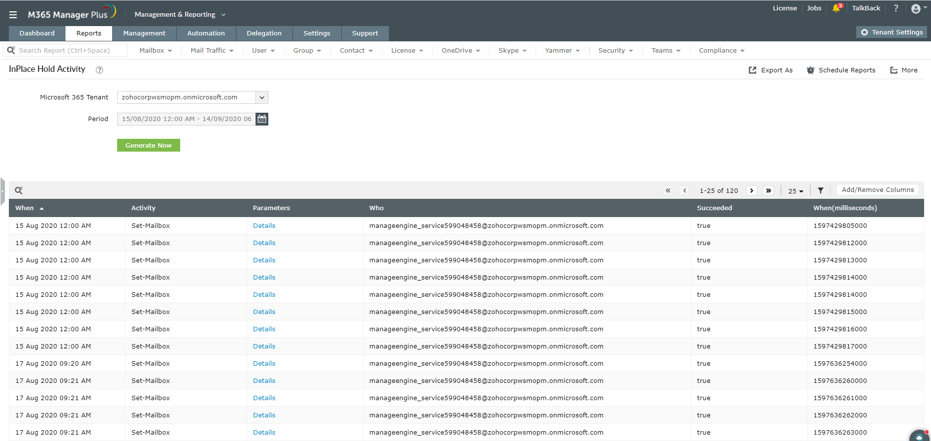 M365 Manager Plus ile PowerShell cmdlet'lerinin geçerliliği konusunda endişelenmenize gerek yoktur. Yerinde Saklama ve eKeşif Etkinliği raporu, Microsoft 365 kurulumunuzda yöneticiler tarafından yapılan tüm Yerinde ve eKeşif aramalarının tüm denetim ayrıntılarını sağlar.