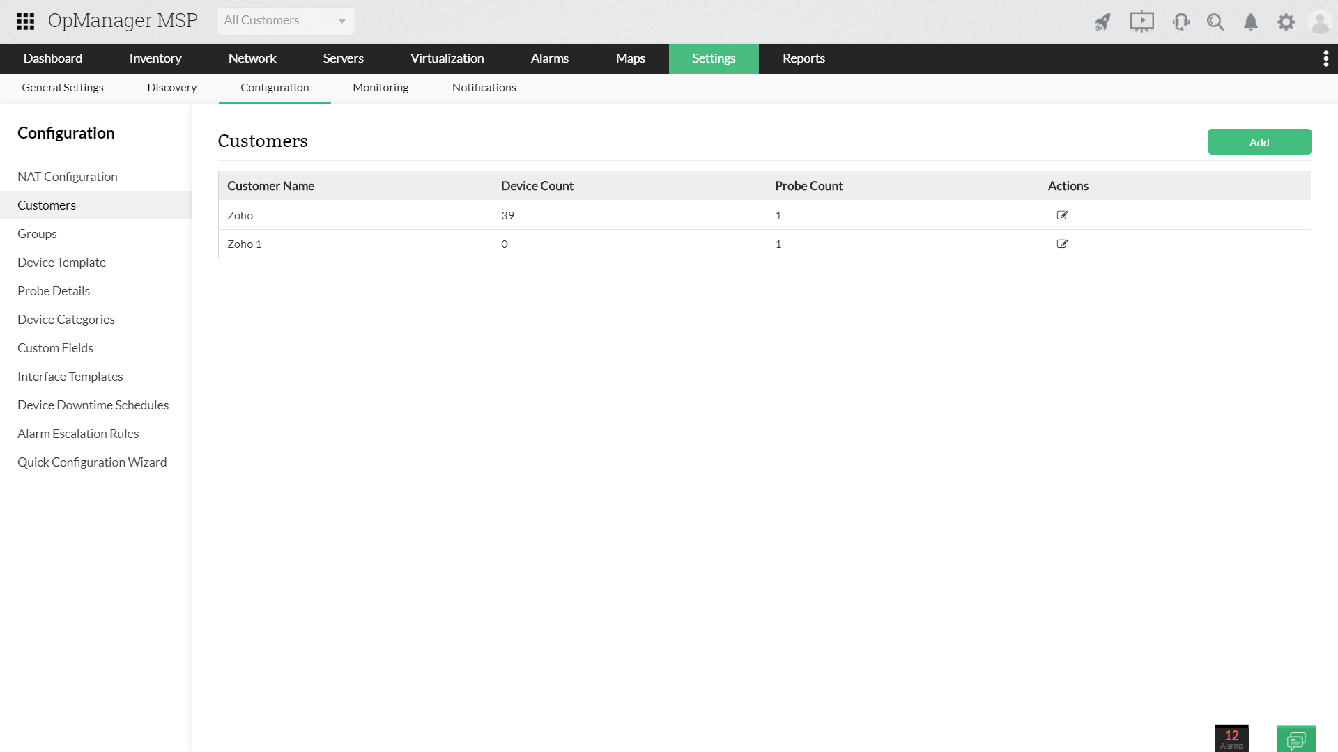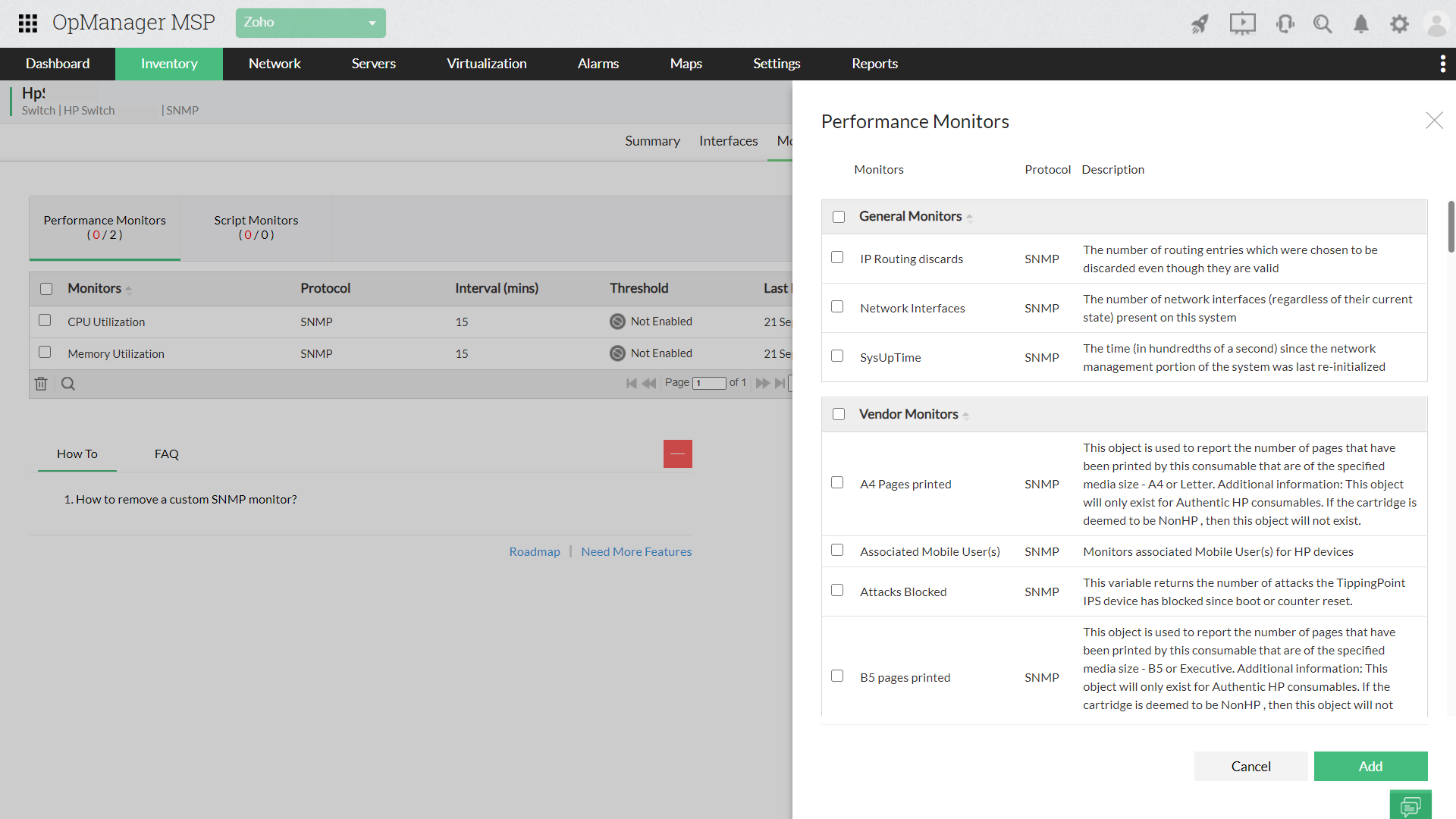 Çoklu kiracılı bir ağ izleme yazılımı olan OpManager MSP, birden fazla müşterinin ağını performans, kullanılabilirlik ve sağlık durumu açısından izlemenizi sağlar. Çoklu satıcılı ağ cihazları için SNMP/WMI kullanarak yönlendiriciler, anahtarlar ve sunucular gibi önemli performans ölçümlerini izleyebilirsiniz.