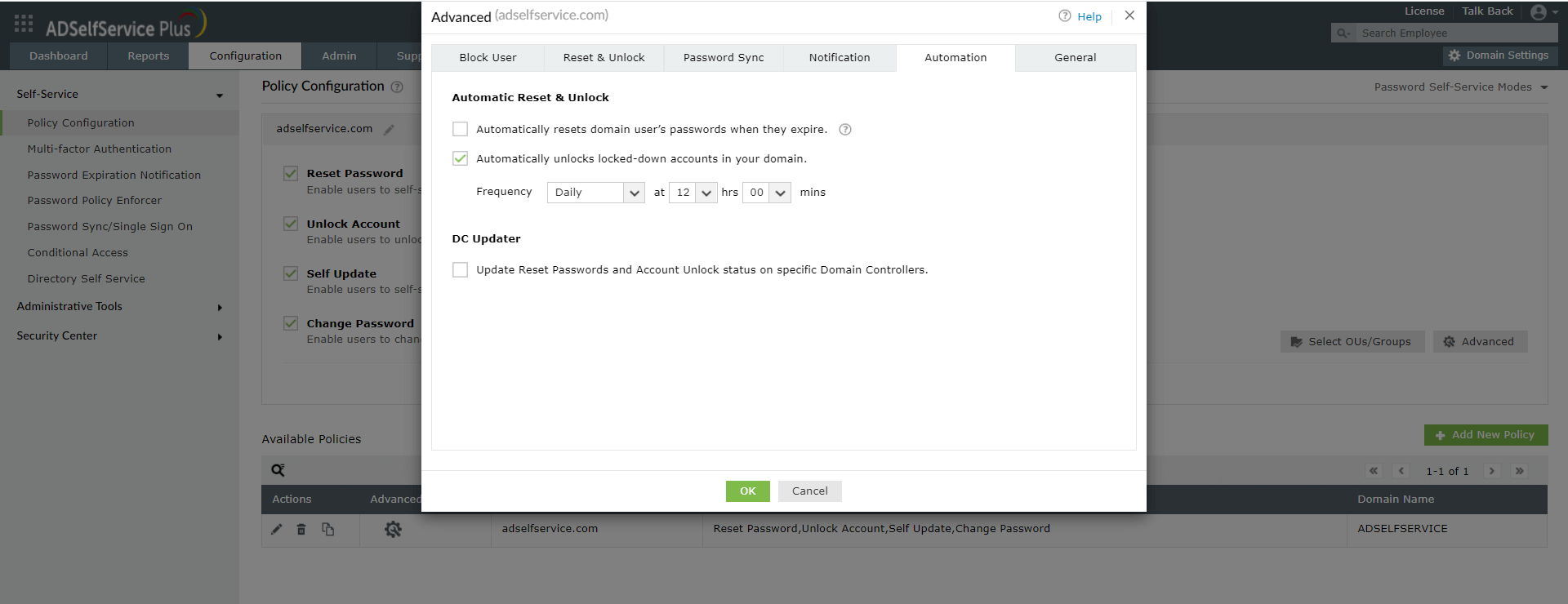 - İlkeyi oluşturmak için gerekli bilgiler sağlandıktan sonra, Gelişmiş’e tıklayın, Otomasyon sekmesinde gezinin ve Etki alanınızdaki kilitli hesapların kilidini otomatik olarak açar onay kutusunu seçin.