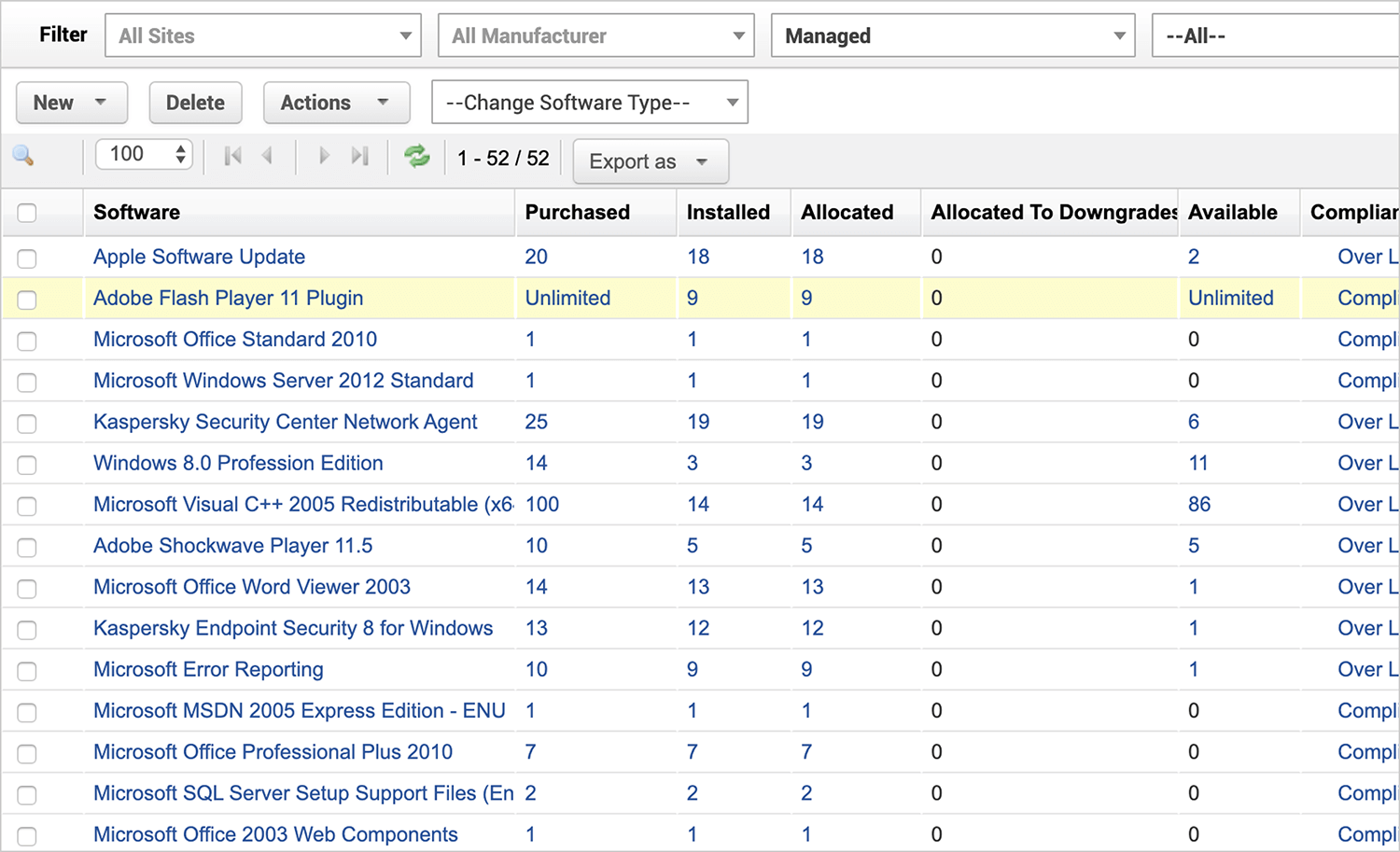 - Büyük resme (satın alınan tüm yazılım lisansları, durumları ve yazılım uyumluluk durumu) bir bakış sunan ve aynı zamanda yazılım varlıklarının detaylı şekilde izlenmesini sağlayan verimli bir yazılım lisansı yönetim aracını devreye sokun.