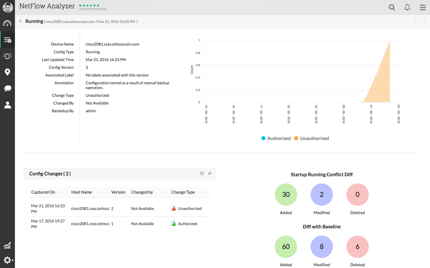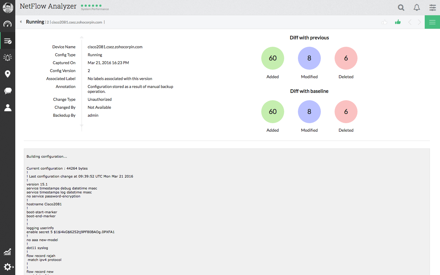 NCM 附加元件會定期監視組態的變更情況。對現有組態的任何變更以及變更的時間和日期將會立即透過郵件進行通知。它還讓您可對變更執行稽核,注入是誰在什麼時候執行了何種動作。這可讓您找出組態中的錯誤以便採取相應行動。