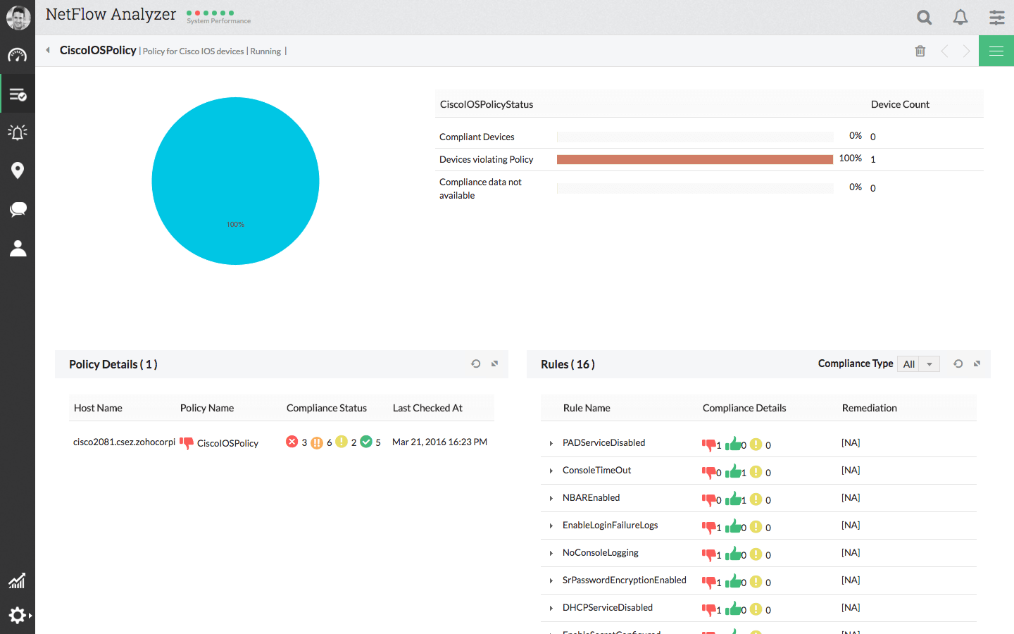 NCM 附加元件幫助網路管理員定義和實施標準,確保特定字串、命令或值存在或者不存在。NCM 附加元件會掃描組態以檢查對所定義規則/原則的合規並報告違規情況。它還可讓您生成關於原則合規及違規的報告。