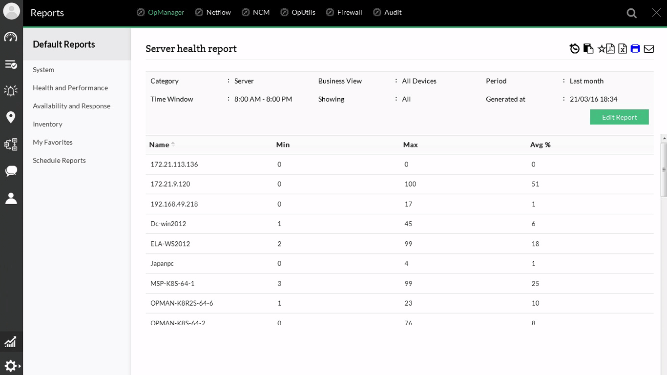 透過 100 多個有關可用性、資源使用率、錯誤事件等的立即可用伺服器效能報表,OpManager 為您的下一次容量新增,提供了即時可用的資訊。另外,您可以建立自己的自訂報表,例如資料中心中所有伺服器的可用性和回應時間的每日報表,並將這些報表器每天自動傳送到您的郵箱。