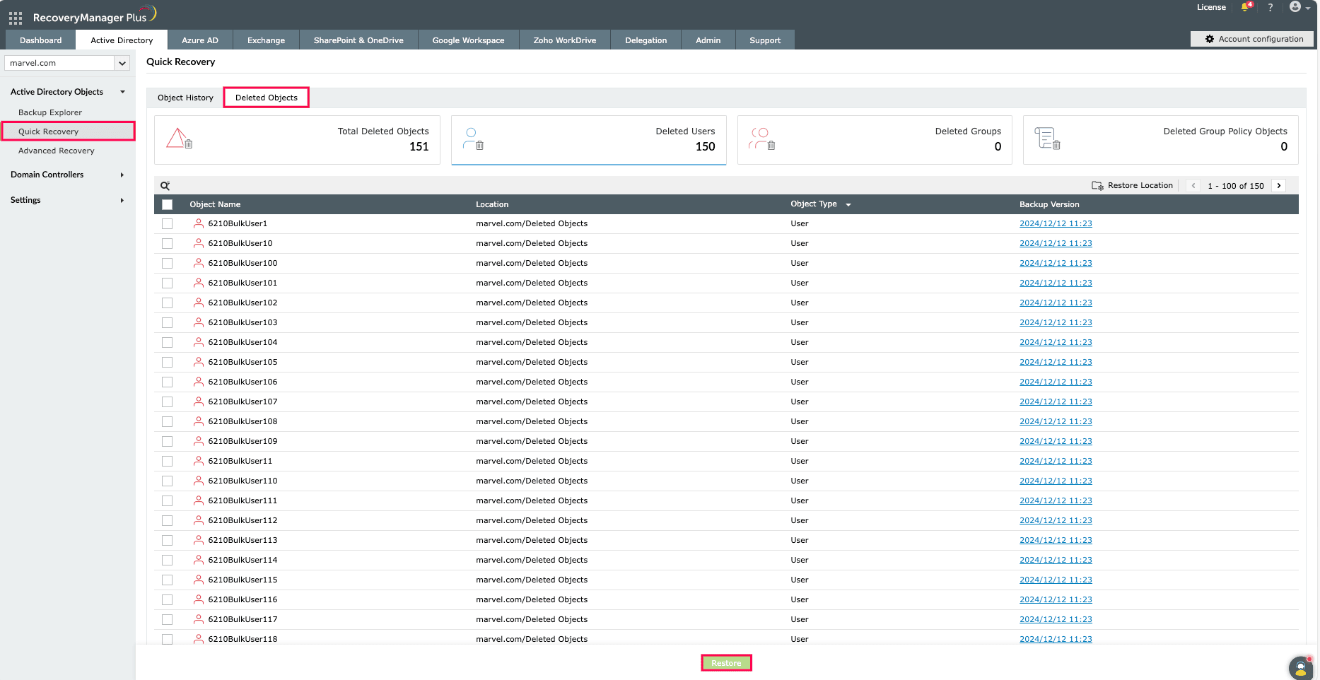 Figure 1: Restoring deleted AD user objects using RecoveryManager Plus