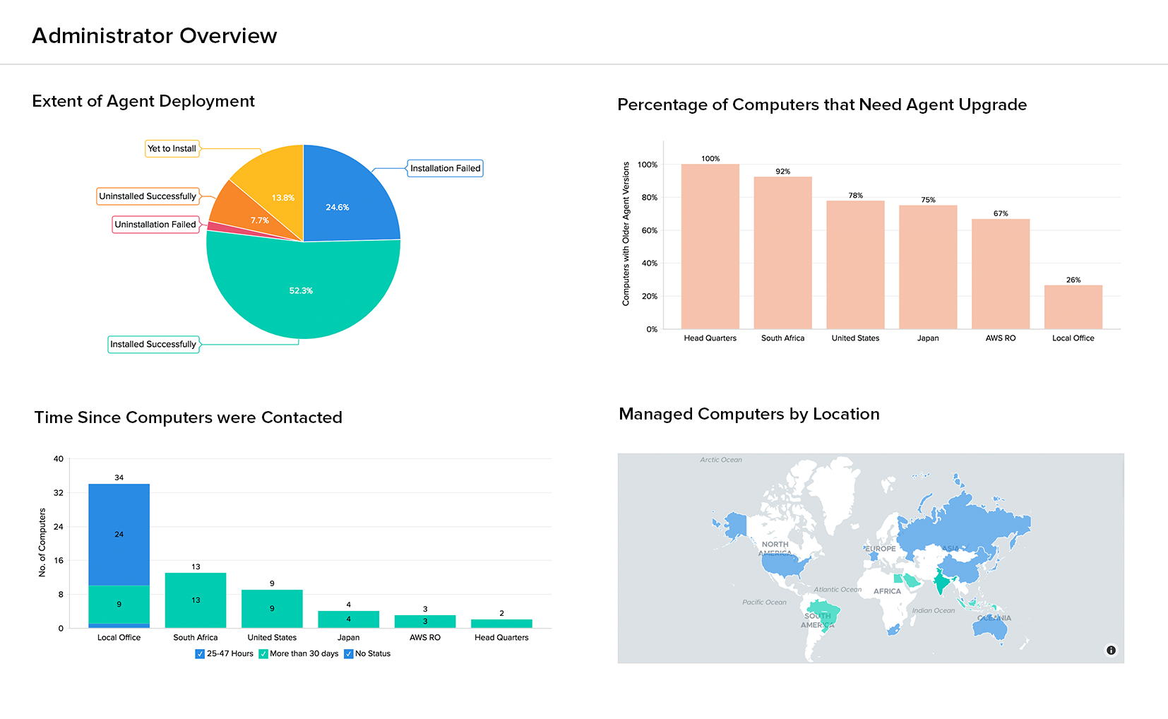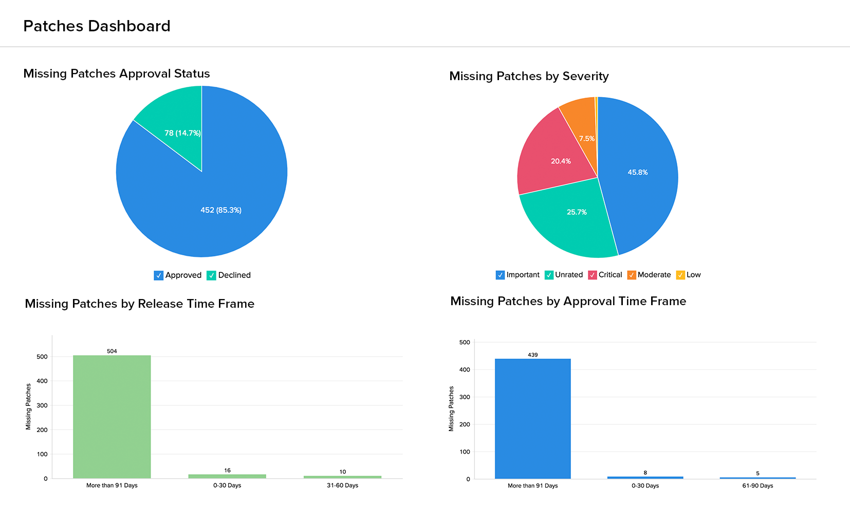 With advanced analytics, you can easily keep tabs on patch deployment statuses across your IT ecosystem from a single console. This ensures you stay patch compliant with standards such as SOX, HIPAA, PCI DSS, etc.