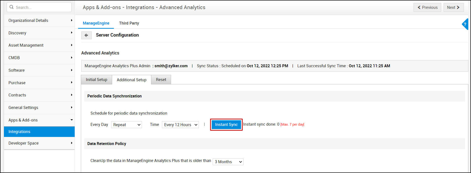 • Navigate to the Additional Setup tab and click the Instant Sync button.