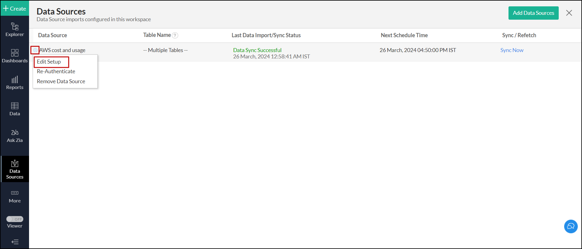 - Click the Settings icon that appears on the mouse over the AWS Cost and Usage data source and click the Edit Setup option.