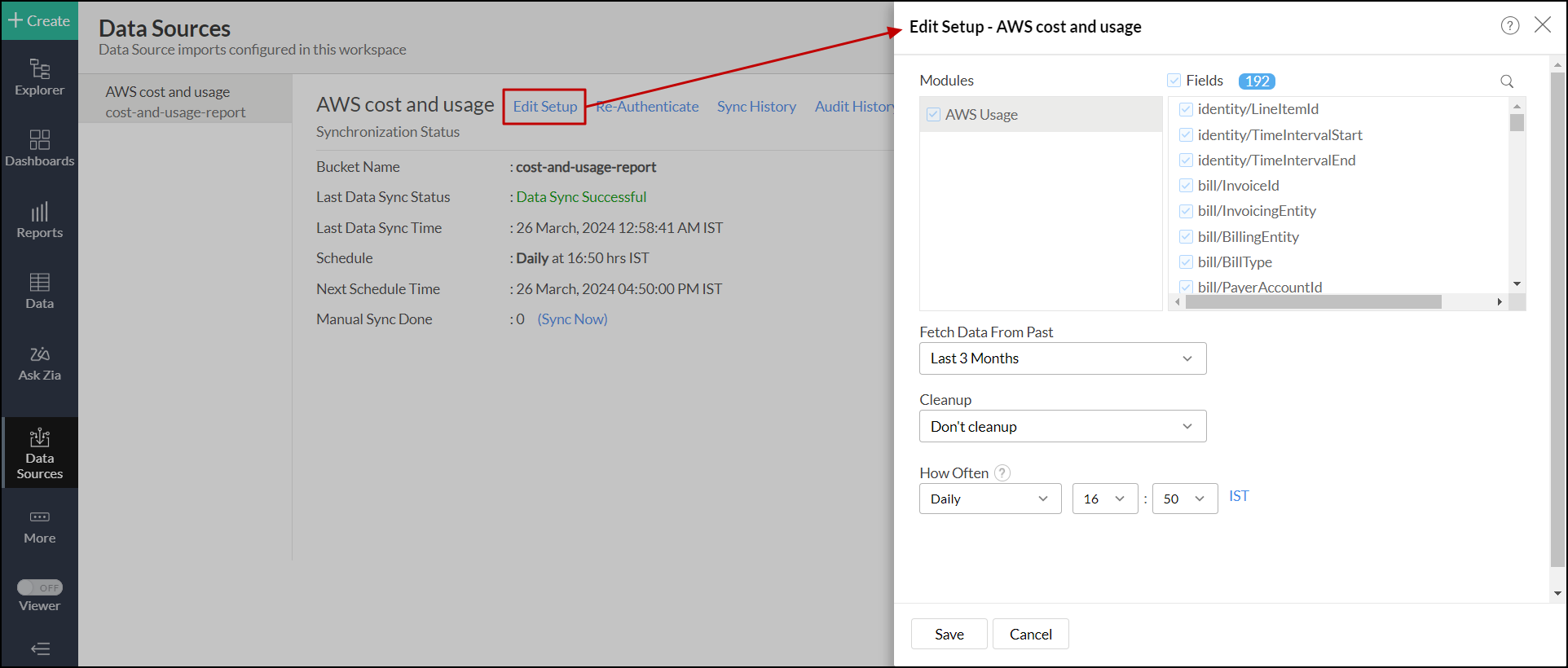 - Navigate to the AWS Cost and Usage data source, and click the Edit Setup link.