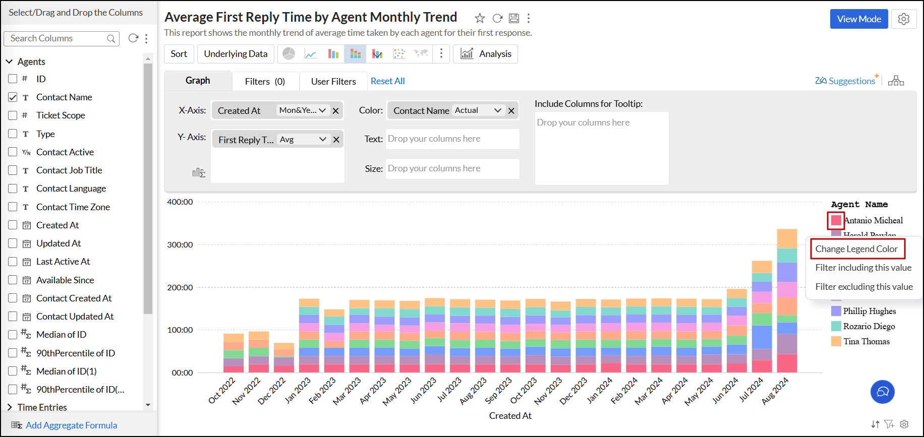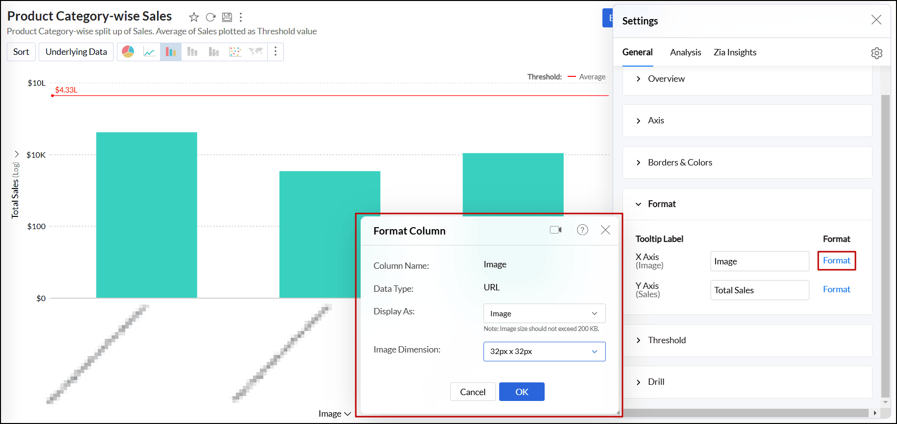 Analytics Plus lets you modify the format of a column, including options for alignment, decimal places, date formats, currency, symbols, and more. Depending on the data type, you can choose how to display the data in the chart.