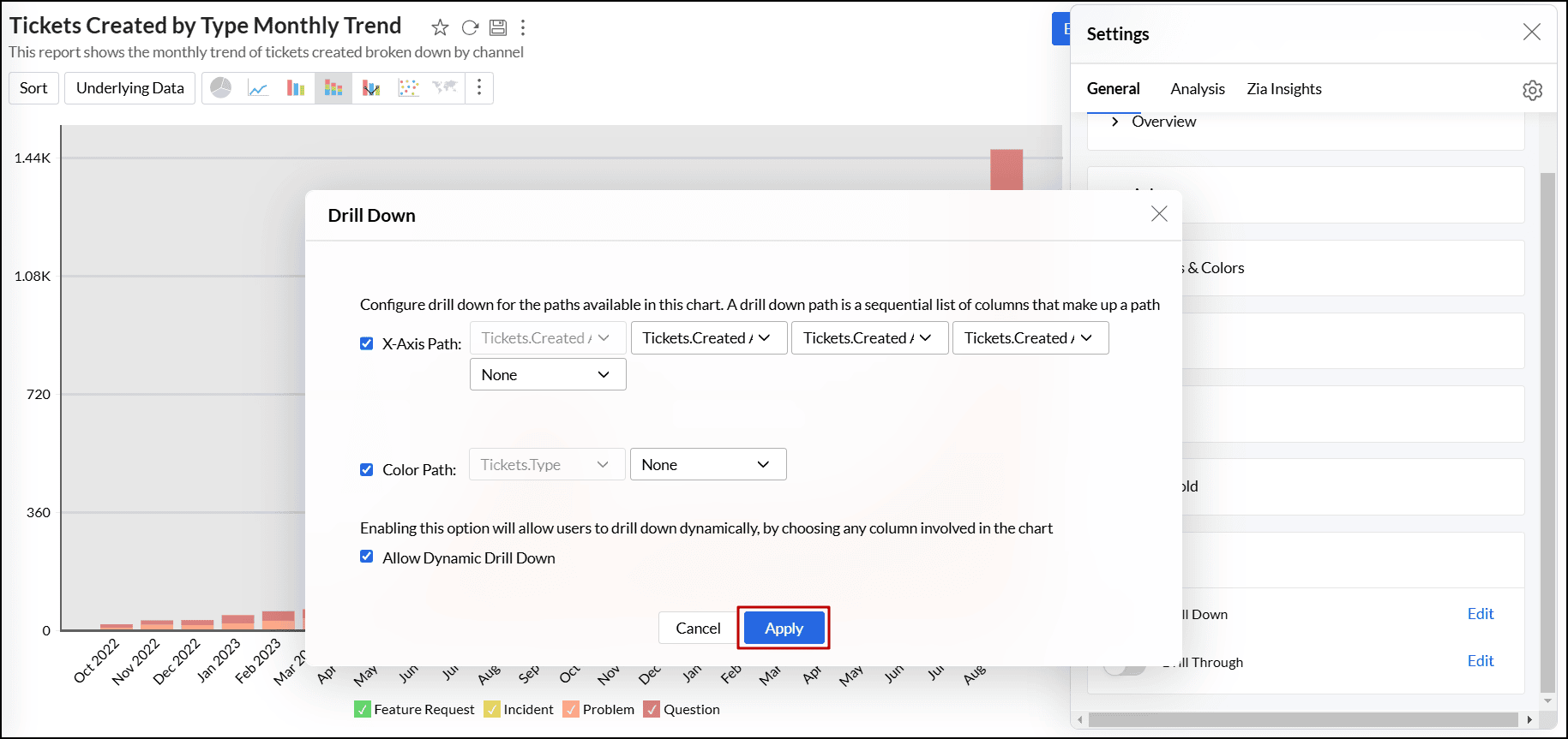 - Drill Down: Deselect this to remove the drill down option from your chart completely.