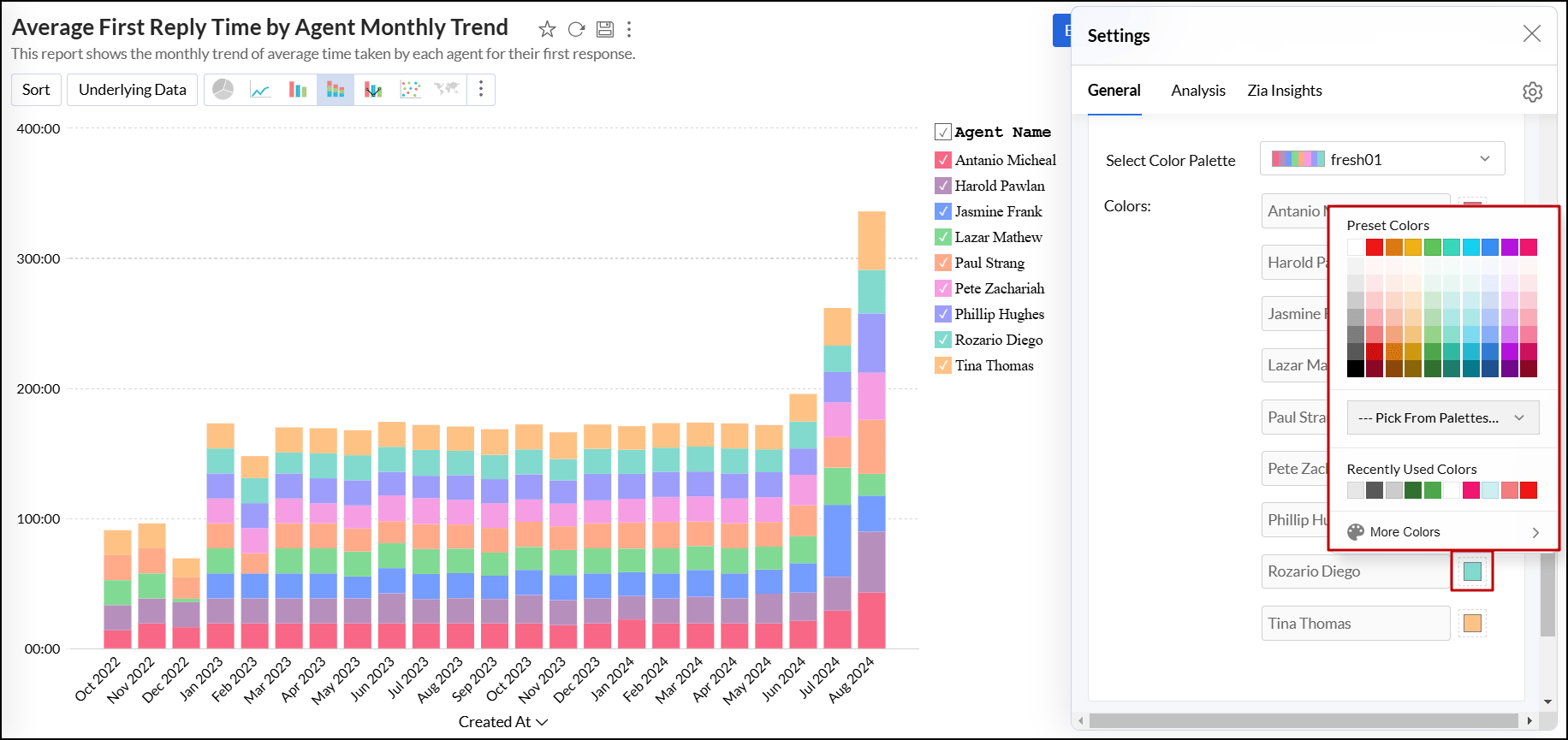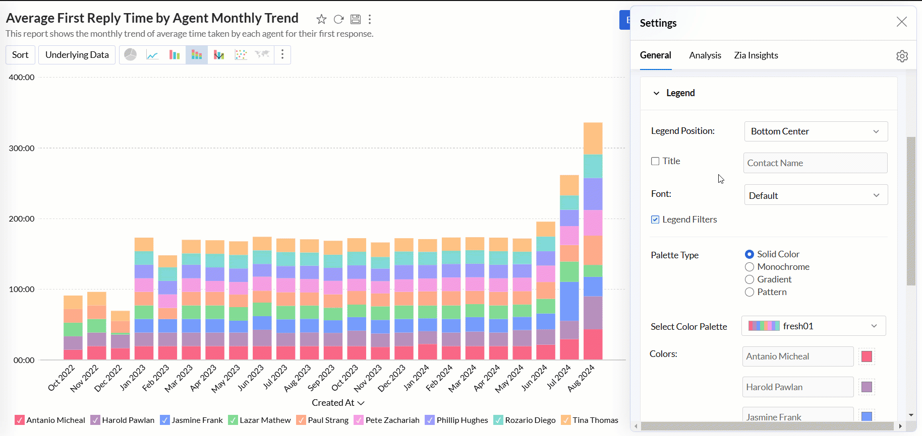 - Color Palette: This option enables you to choose the color palette you wish to apply to your data series. You can select a palette based on the selected Palette Type (Solid Color, Monochrome, or Gradient). Analytics Plus provides a predefined set of color palettes, and you also have the option to create and add custom palettes to fit your needs.