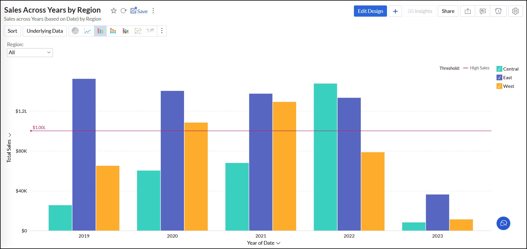 - Show Missing values: This option displays the data points with missing values in the chart. Please note that this option is displayed only when the chart has missing data points.