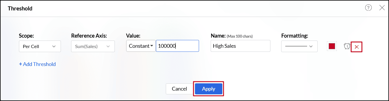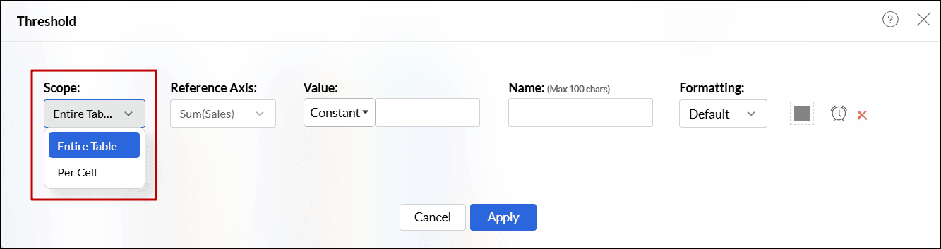 - Per Cell: Applies different threshold lines for each data point represented in the report.