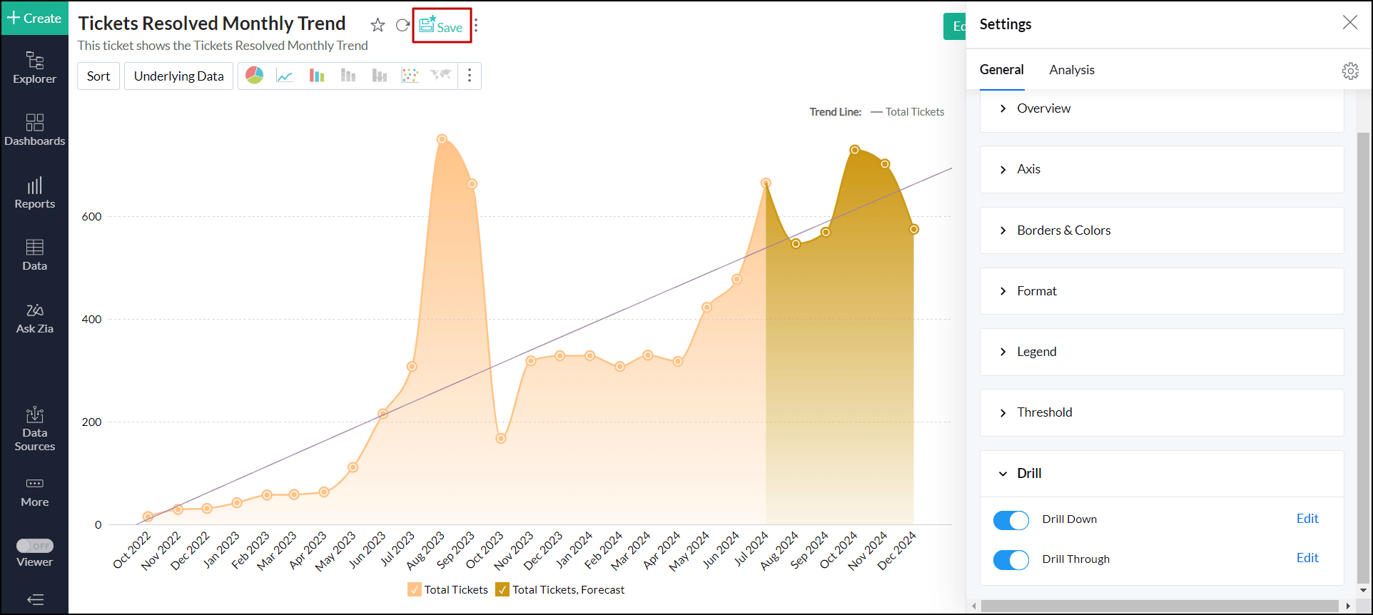- Analysis: This tab lets you customize the settings for advanced analytical features such as Forecasting, Trend Line, Cluster Analysis, Anomaly / Outlier, What-if Analysis, and Data Alerts. Please note these options will appear here once you enable them in the charts.