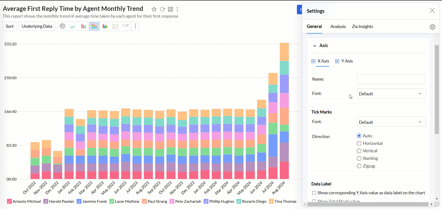 Analytics Plus automatically sets values for chart axes (X-axis and Y-axis) such as labels, axis range, interval between labels, etc. You can also customize these properties as required.