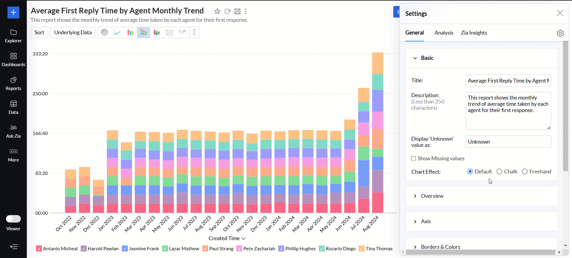 This section lets you customize the elementary details of the report, such as the Title, Description, representing Missing values, and other chart-specific options.