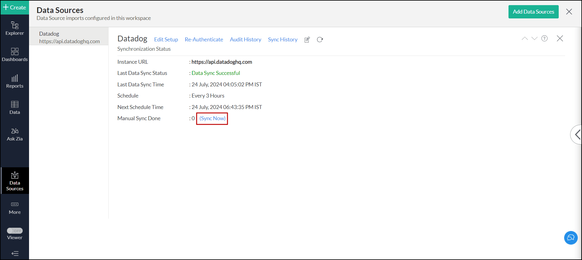 Yes. To do this, click the Data Sources option from the side panel. In the page that appears, navigate to the Datadog source and click the corresponding Sync Now button.