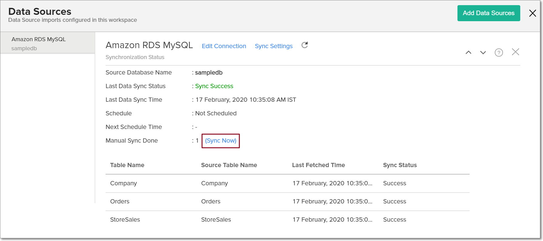 • Navigate to the required data source, and click the Sync option that appears on mouse over the required table name.