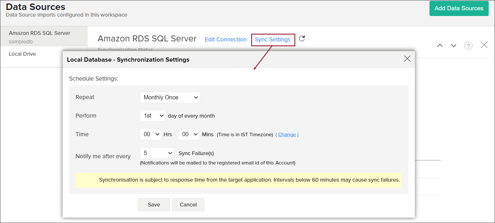Click Save. The data from your Amazon RDS SQL Server database will be imported into Analytics Plus in the specified intervals.
