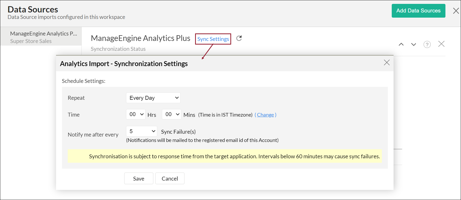 Click Save. The data from your source workspace will be imported into Analytics Plus in the specified intervals.