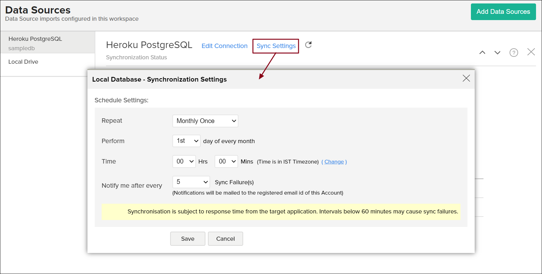 If you have created reports in Analytics Plus over columns or tables that don't have a direct mapping to the data in the database, mismatches will occur. These mismatches will be listed in the Cloud Database Connection Settings page, which can be accessed by clicking the Data Sources button from the side panel. Refer the following question to know more.