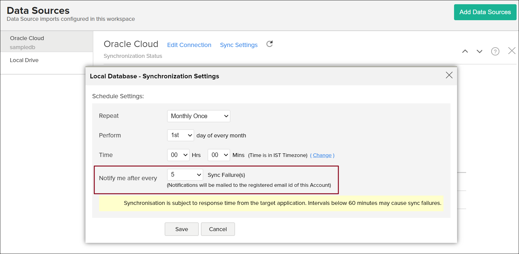 Specify the number of consecutive import failure after which you are to be notified in the Notify me after every 'N' Sync Failure (s) section.