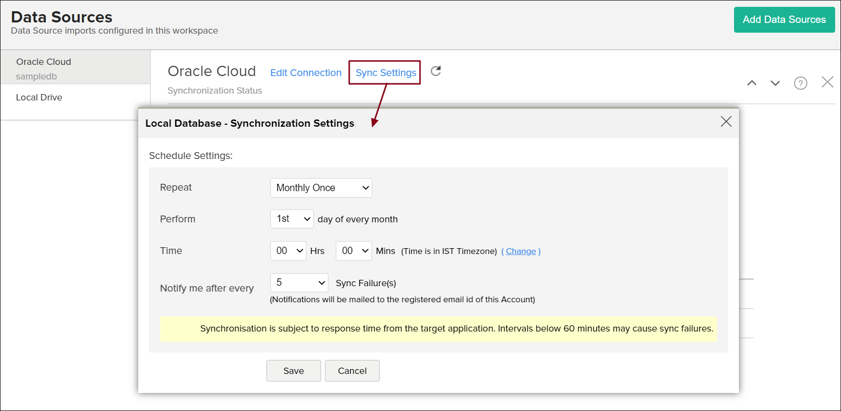 Click Save. The data from your Oracle Cloud database will be imported into Analytics Plus in the specified intervals.