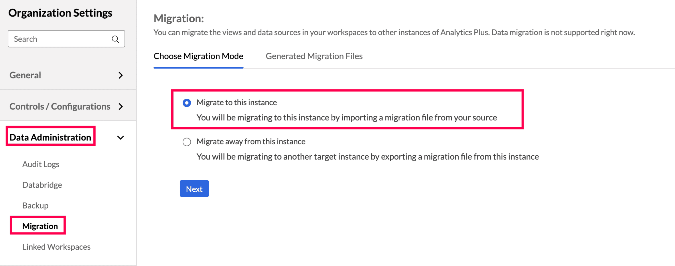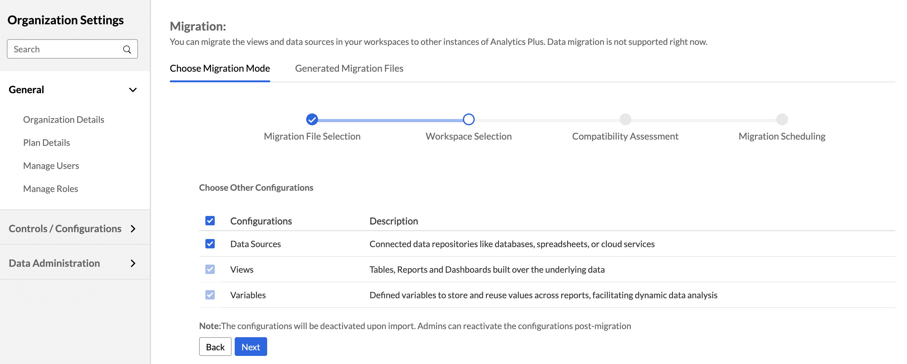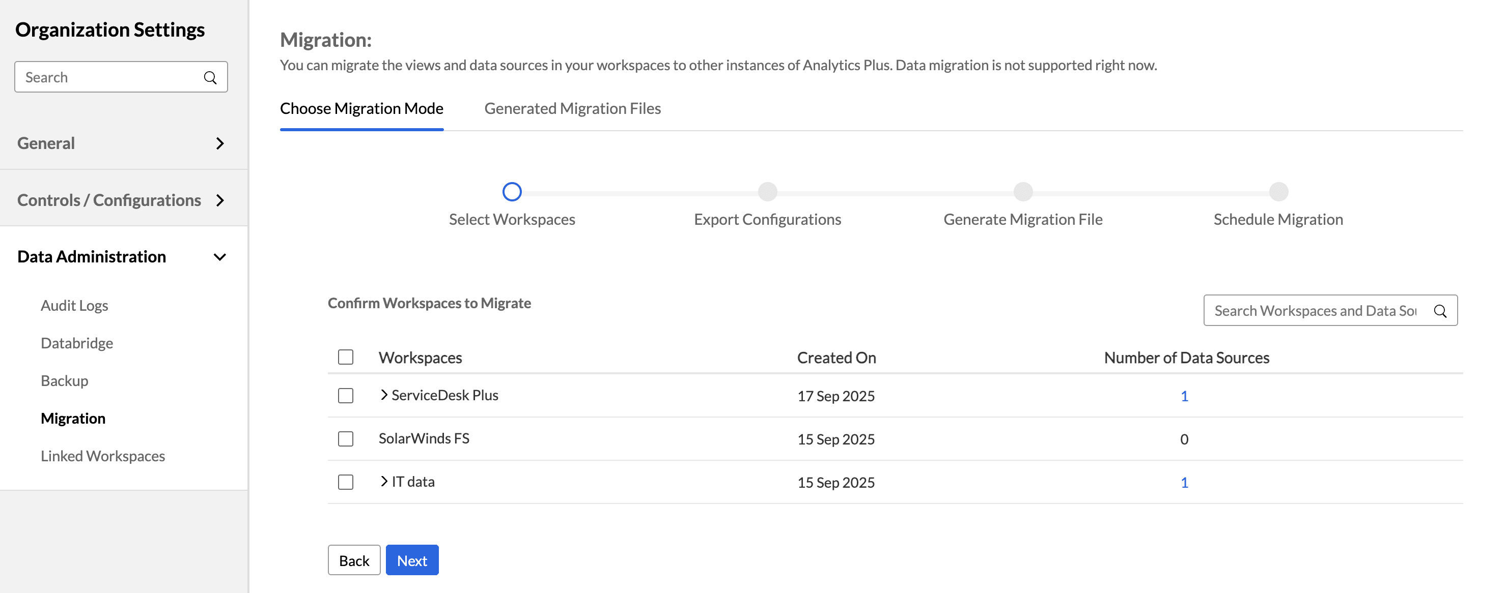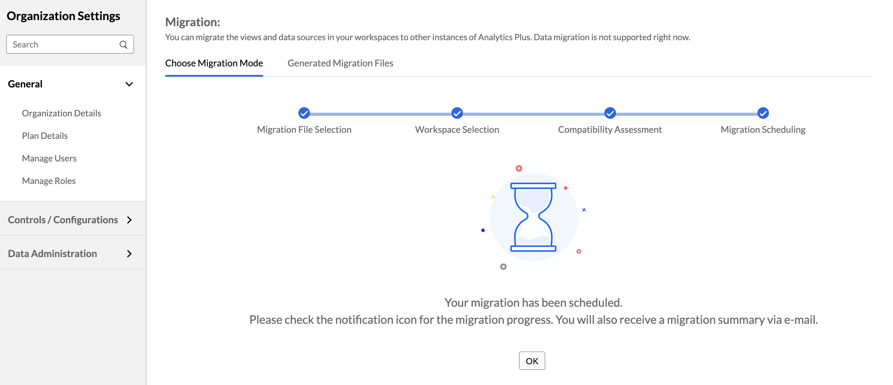 Important note: The migration might fail when importing data sources or configurations that are not supported in the target Analytics Plus account. Detailed reasons for such failures will be sent in the migration summary email.