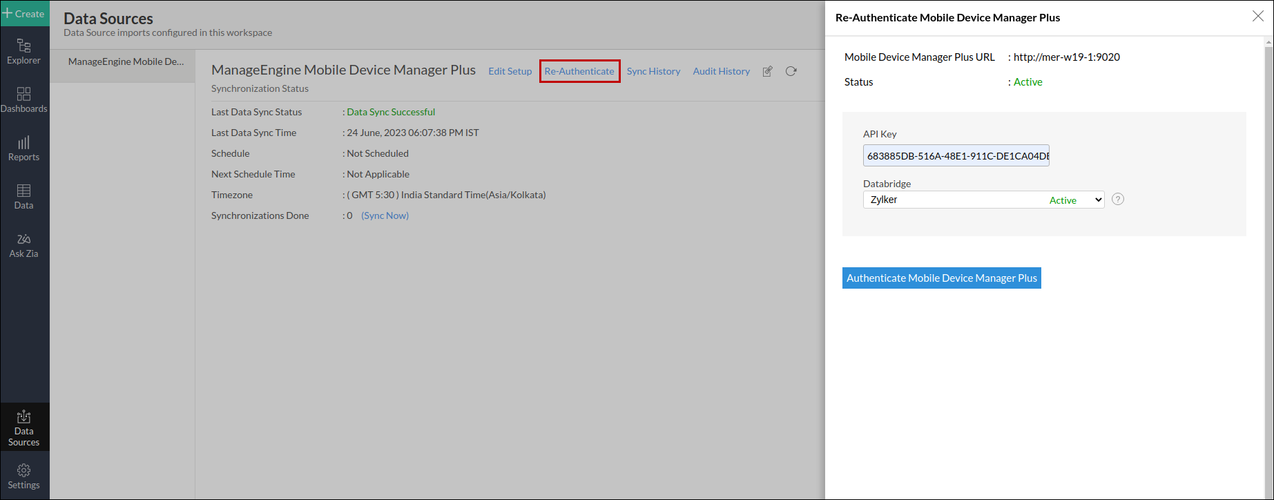 The synchronization of your Mobile Device Manager Plus data can sometimes fail, due to a variety of reasons. To resolve this, click the Data Sources option from the side panel and click the Re-Authenticate link. In the popup that appears, click Authenticate Mobile Device Manager Plus. Verify the Mobile Device Manager Plus URL, enter the regenerated API key, ‌select the required ManageEngine Databridge from the Databridge drop-down, and click the Authenticate Mobile Device Manager Plus button.