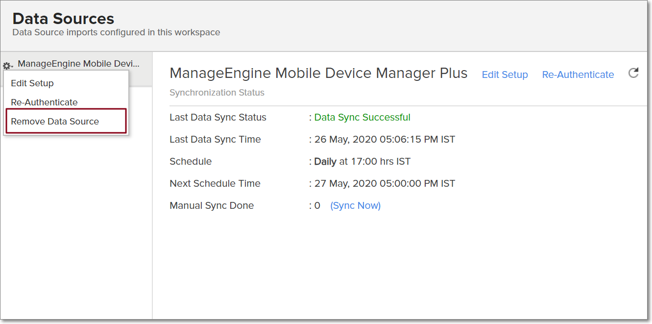 To edit the connection and synchronization settings, select Data Sources -> Mobile Device Manager Plus from the side panel.