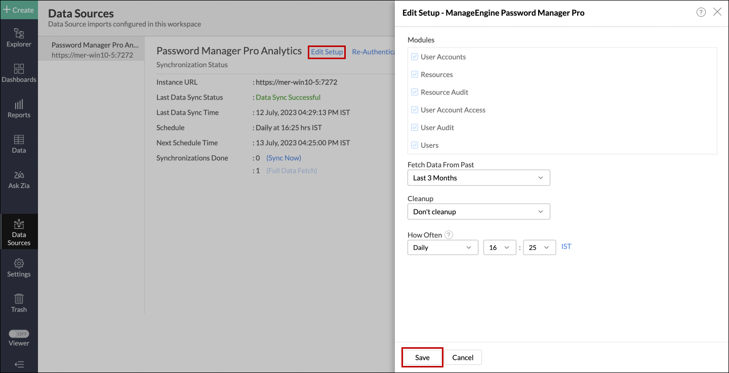 2. Navigate to the Password Manager Pro data source, and click the Edit Setup link.