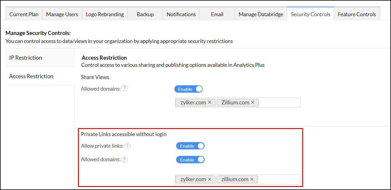 This option allows you to control various sharing and publishing options in your Analytics Plus organizational account. To access the available access restriction options,