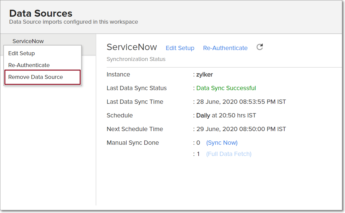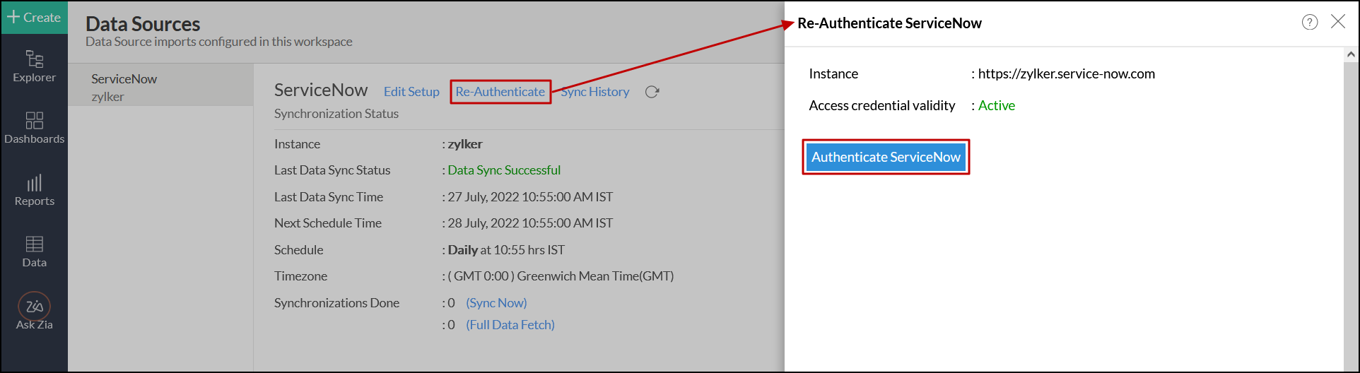 The import or synchronization process of your ServiceNow data can fail sometimes, due to a variety of reasons. To resolve this, click the Data Sources option from the side panel and click the Re-Authenticate link. In the popup that appears, click Authenticate ServiceNow. Enter the ServiceNow username and password, and click the Authenticate ServiceNow button.