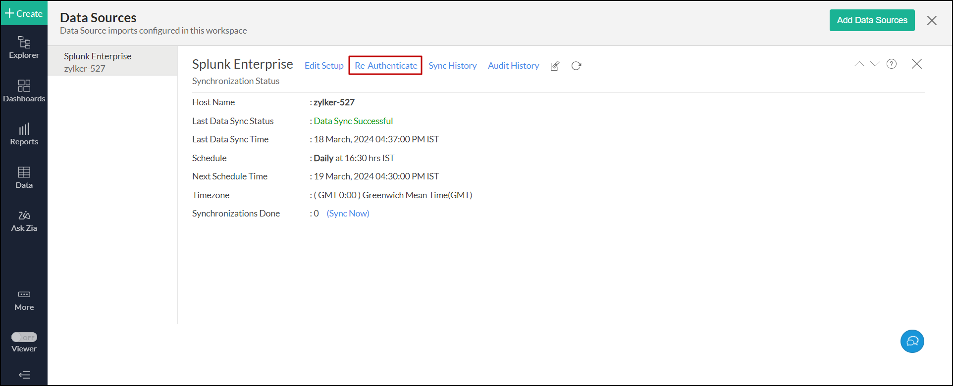2. Navigate to the Splunk Enterprise data source, and click the Re-Authenticate link.
