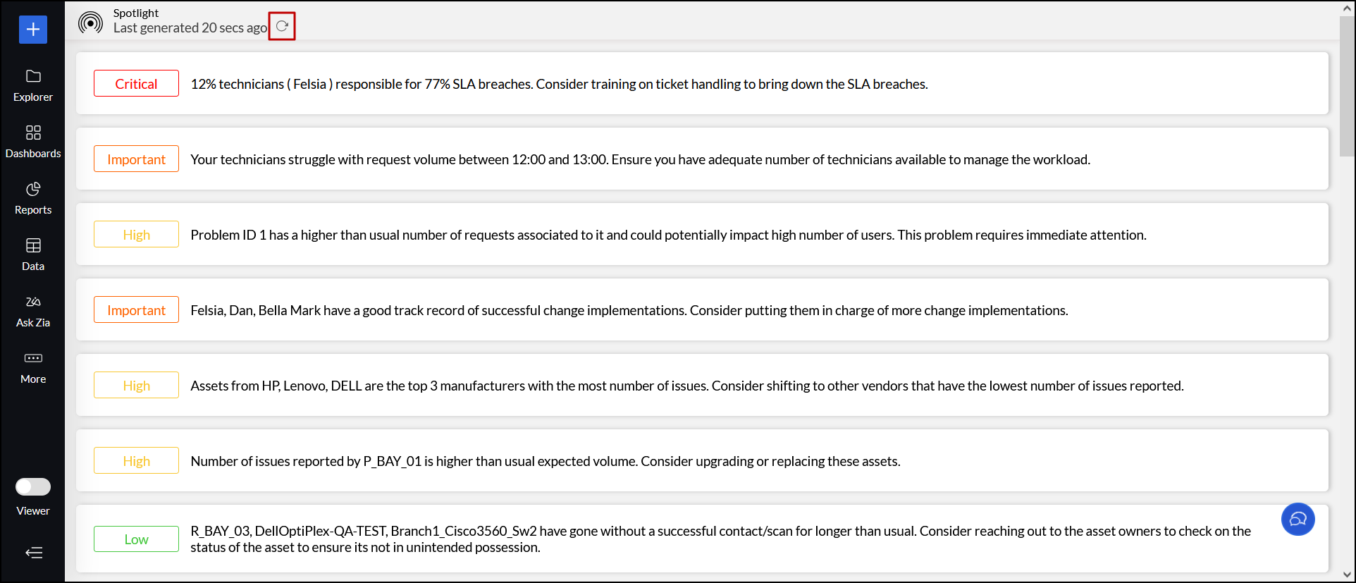 Analytics Plus automatically processes the logic and delivers updated recommendations each time the data is synced from ServiceDesk Plus. However, users can refresh and regenerate the recommendations at any time by clicking the refresh icon at the top. Please note the process time may take some time, depending on the volume of data being processed.