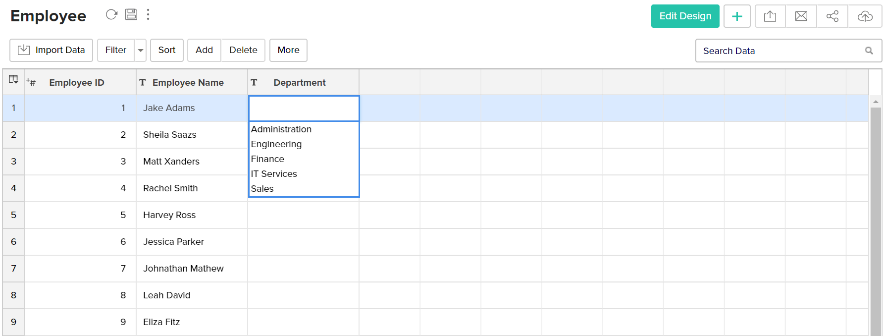 In ManageEngine Analytics Plus, look-up column field displays the looked-up column values as a list in a combo box to choose values instead of typing them in. Let's say a new Department ID look-up column has been added to Employee table, whose values will be looked-up from Department ID in the Department table. When editing a lookup column field, all the Department IDs existing in Department table will be displayed as a list of choices in a combo box as shown below, so that you can choose the appropriate department the Employee belongs to.