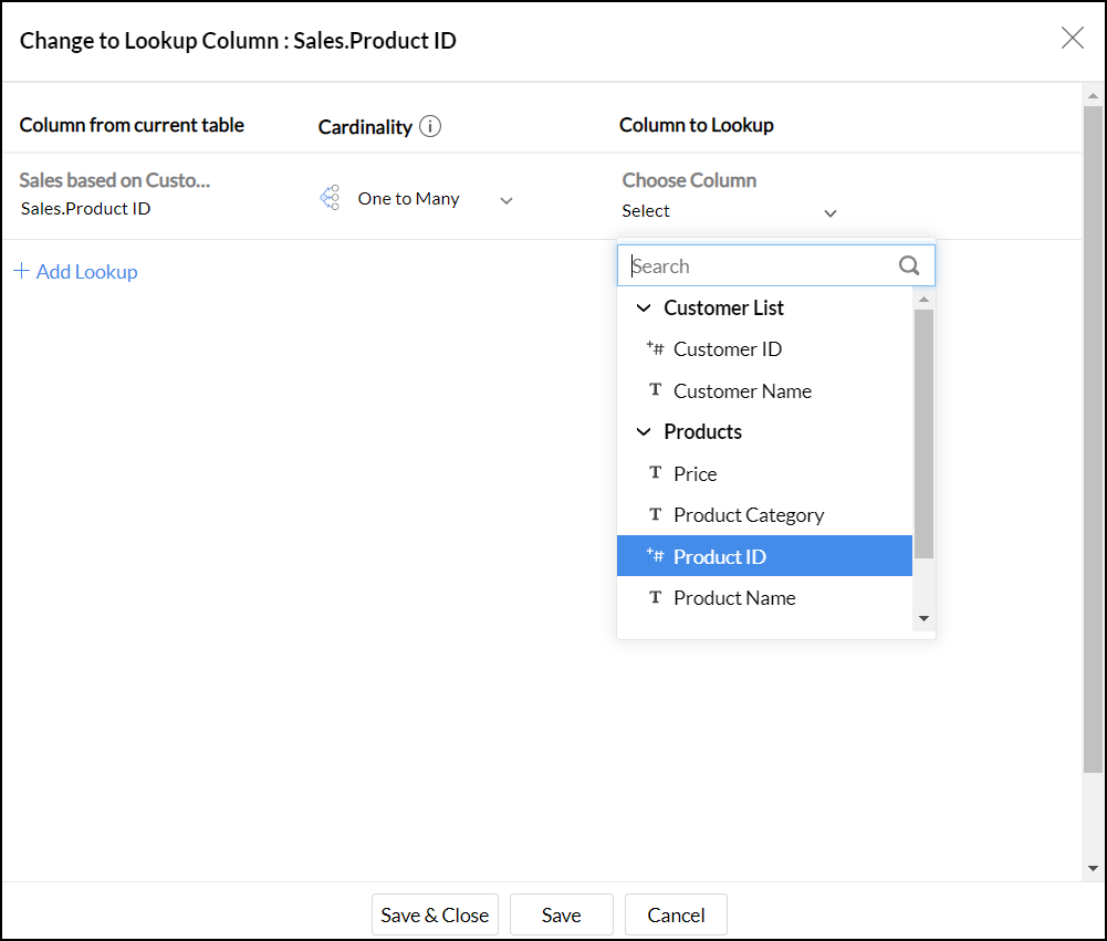 • In the dialog that appears, select a column to look up from the list of tables available in the workspace.