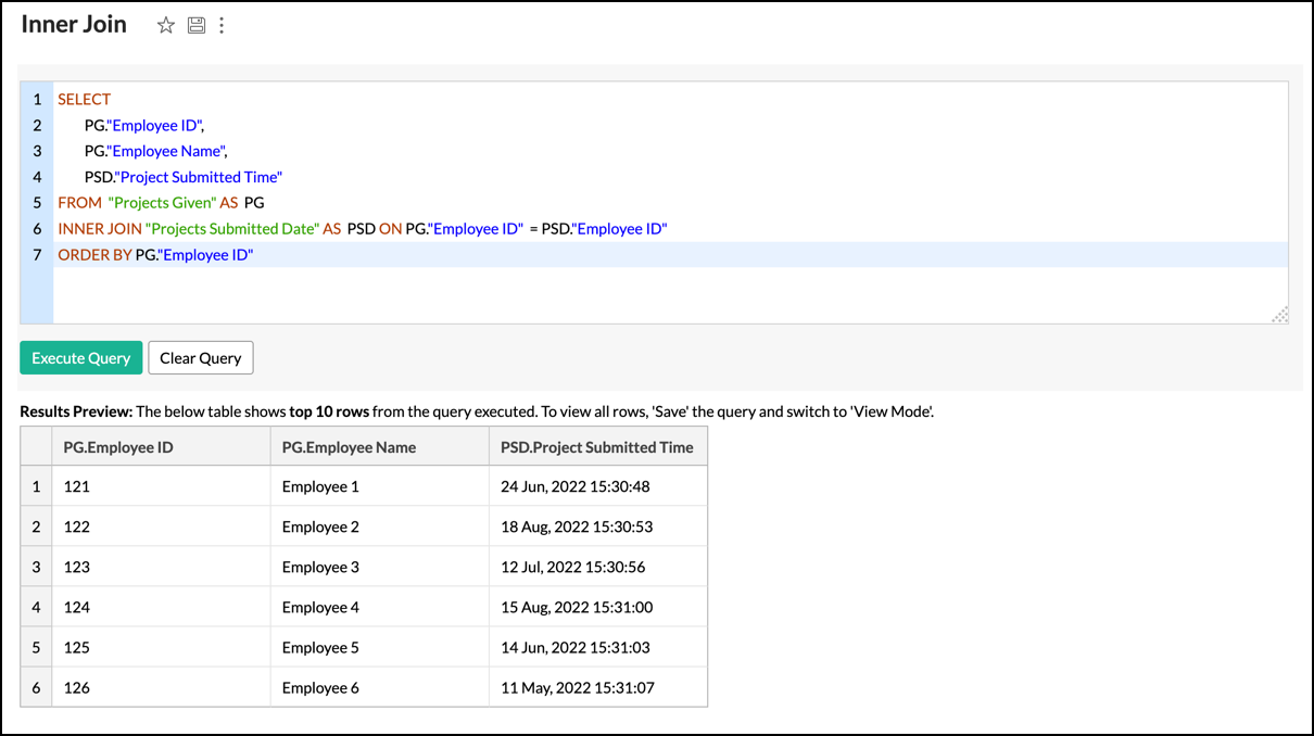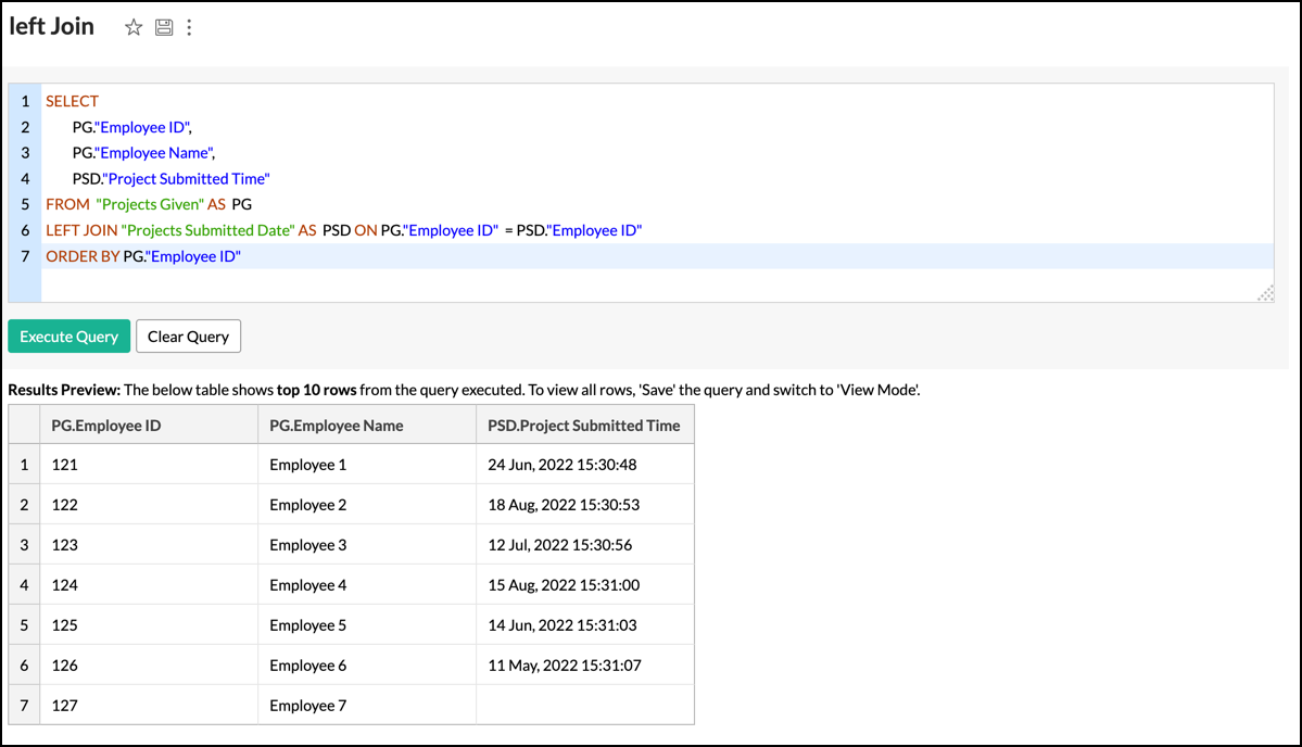 Yes. Analytics Plus lets you merge the common data sets available in different tables using the UNION function. For example, the below query table combines the Employee ID and Employee Name from the Projects Given table with the Employee ID and Employee Name from the Projects Submitted Date table.