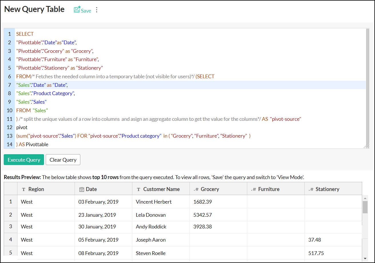 Query tables work just like any other table in the workspace. Analytics Plus enables you to perform all the operations performed over a table created manually or by importing data. Refer the documentation to learn more about table operations.