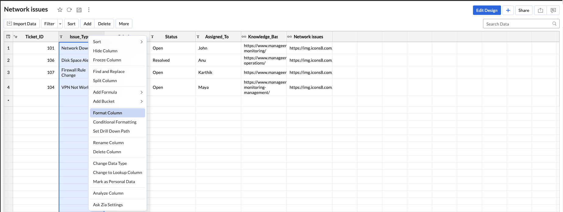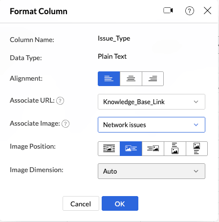 For example, in an organization, issues can be displayed along with relevant icons (e.g., a network symbol for “Network Down,” a disk icon for “Disk Space Alert,” or a firewall icon for “Firewall Rule Change”). These visual indicators help teams quickly identify the nature of a problem without relying solely on text. Follow the below steps to format the column,