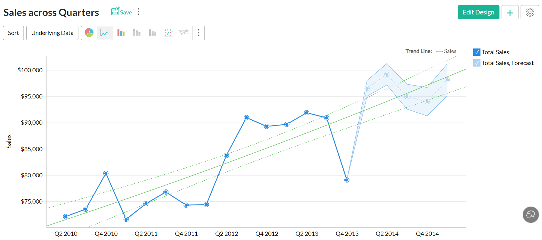 The following is the Sales across Quarters report with a trend line plotted over forecasted data.