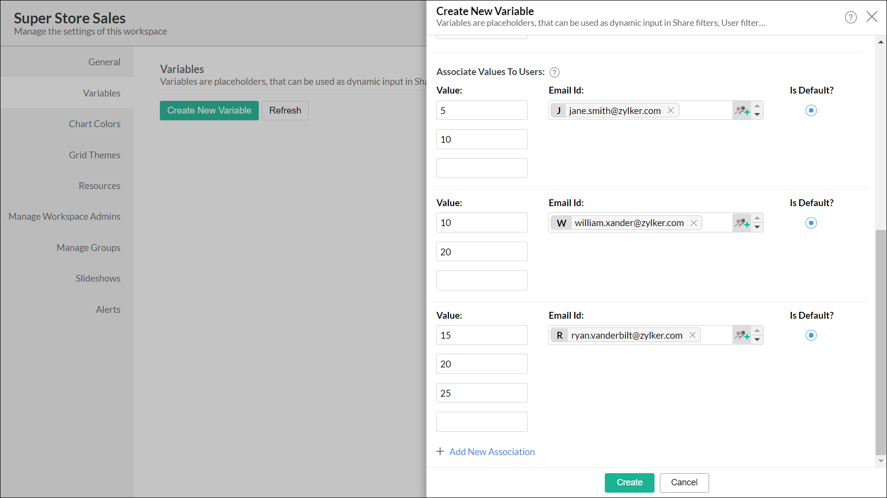 Note: When creating a variable, you can associate the values in the variable to specific users or groups. On accessing shared reports, in cases where multiple values are associated to them, shared users can employ what-if analysis to visualize changes to the report corresponding to the values associated to them.