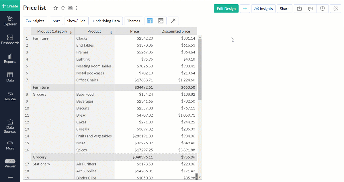 Let's create a pivot report with the discounted prices aggregate formula column. The discount price column values are calculated based on the default value (10%) defined in the variable.