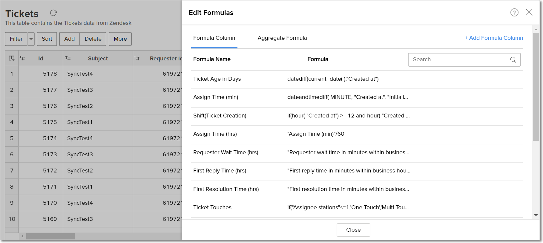 Formulas are calculations that can be defined using the powerful formula engine in Analytics Plus, to create required reports. Refer this documentation to know more. There are also several default formulas created based on the Zendesk modules. To view the default formulas, open the required table, click Add and select the Edit Formulas option.
