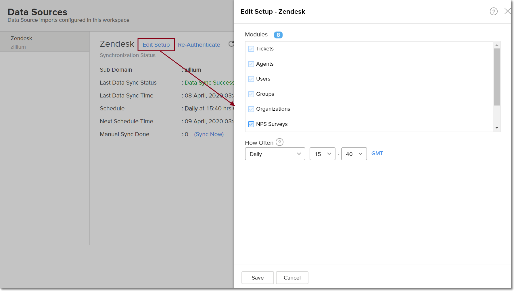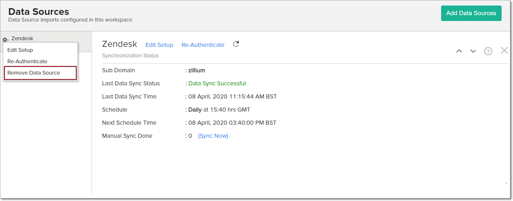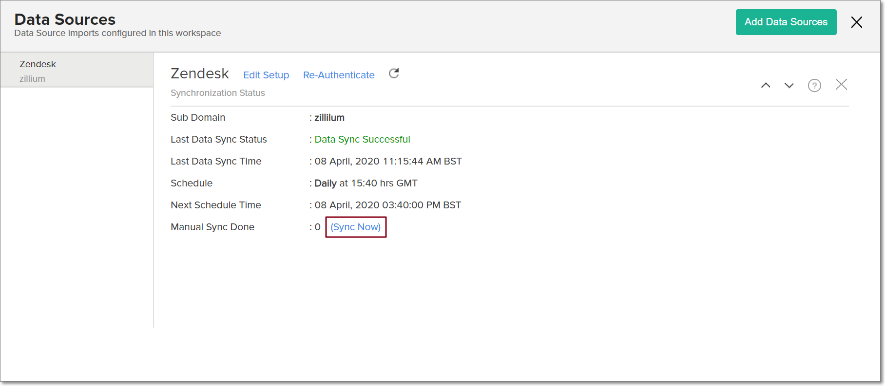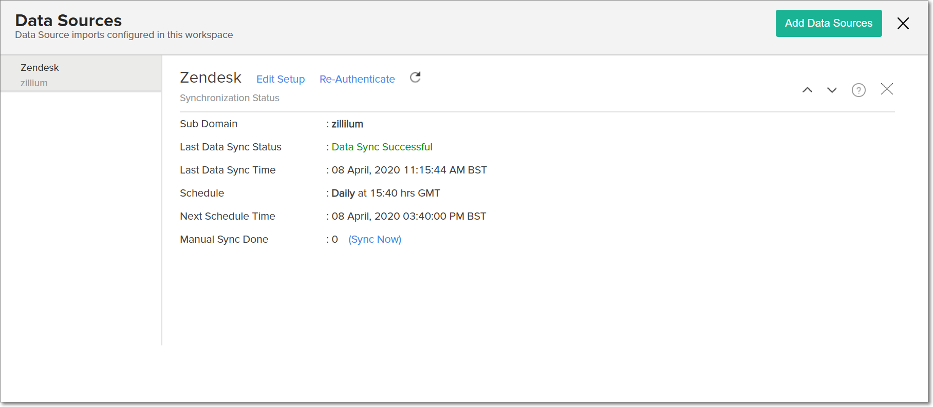 To edit the connection and synchronization settings, select Data Sources -> Zendesk from the side panel.