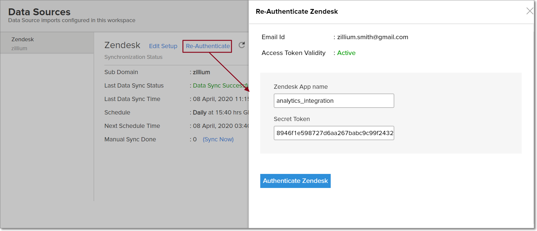 The import or synchronization process of your Zendesk data can fail sometimes, due to a variety of reasons. To resolve this, click the Data Sources option from the side panel and click the Re-Authenticate link. In the popup that appears, click Authenticate Zendesk. Enter the Zendesk App Name and Secret Token and click the Authenticate Zendesk button.