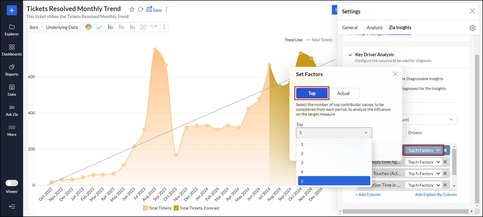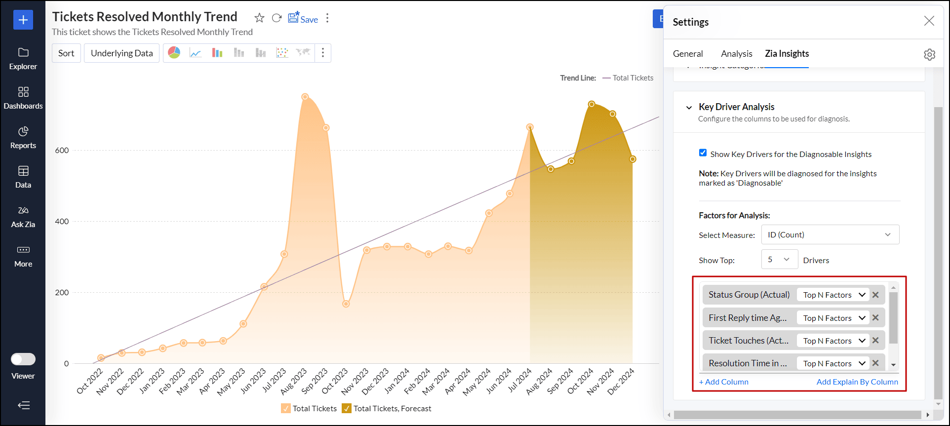 - Navigate to the Zia Insights tab and expand the Key Driver Analysis section.