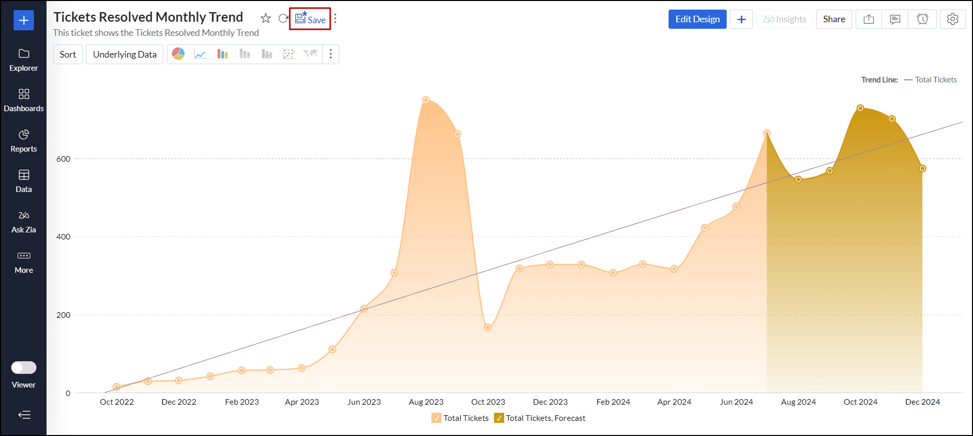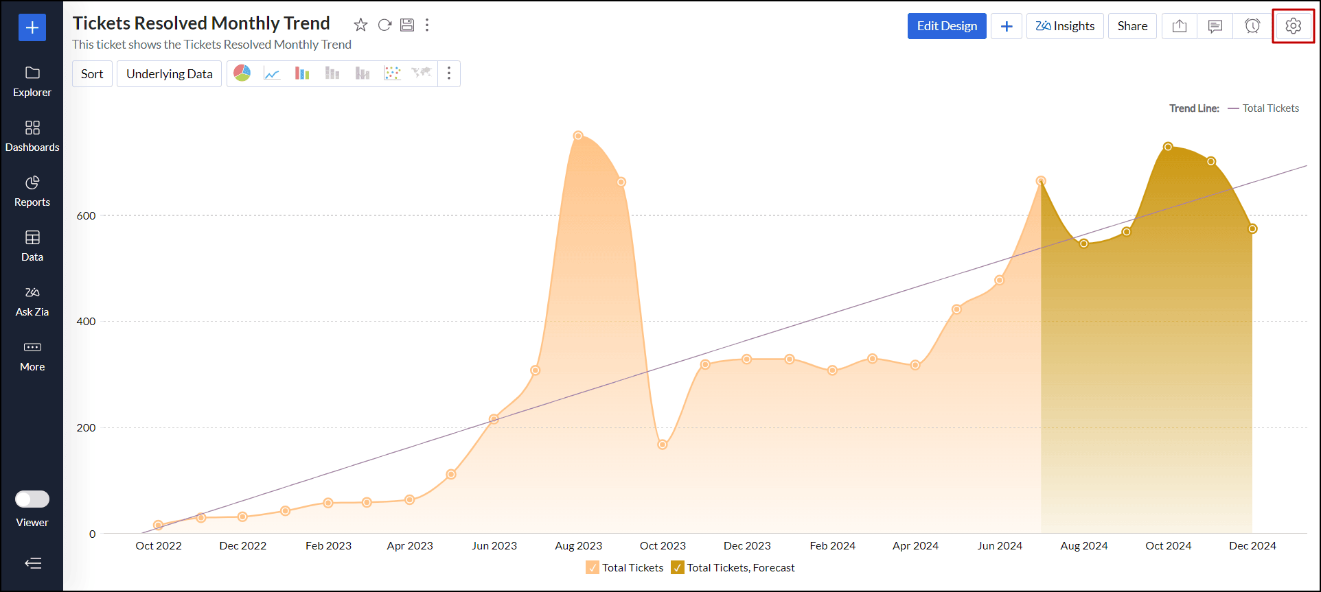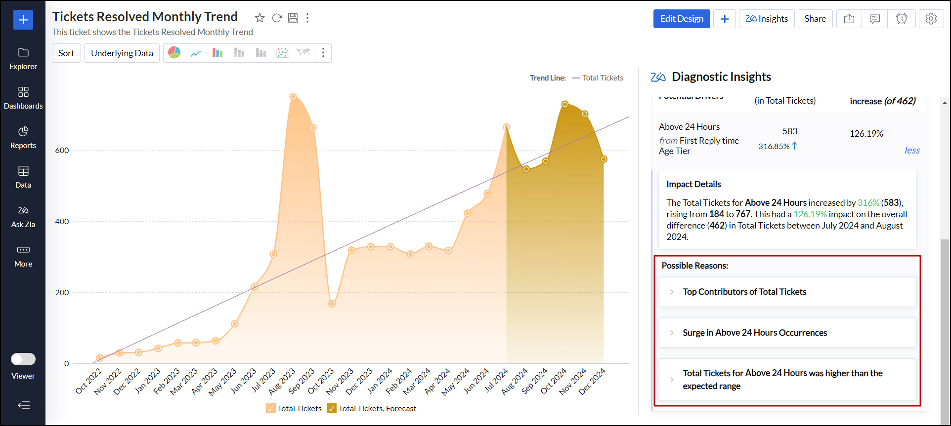 To view the diagnostic insights, click the Diagnosis icon that appears on the Time Series Insights in the Zia Insights dialog.