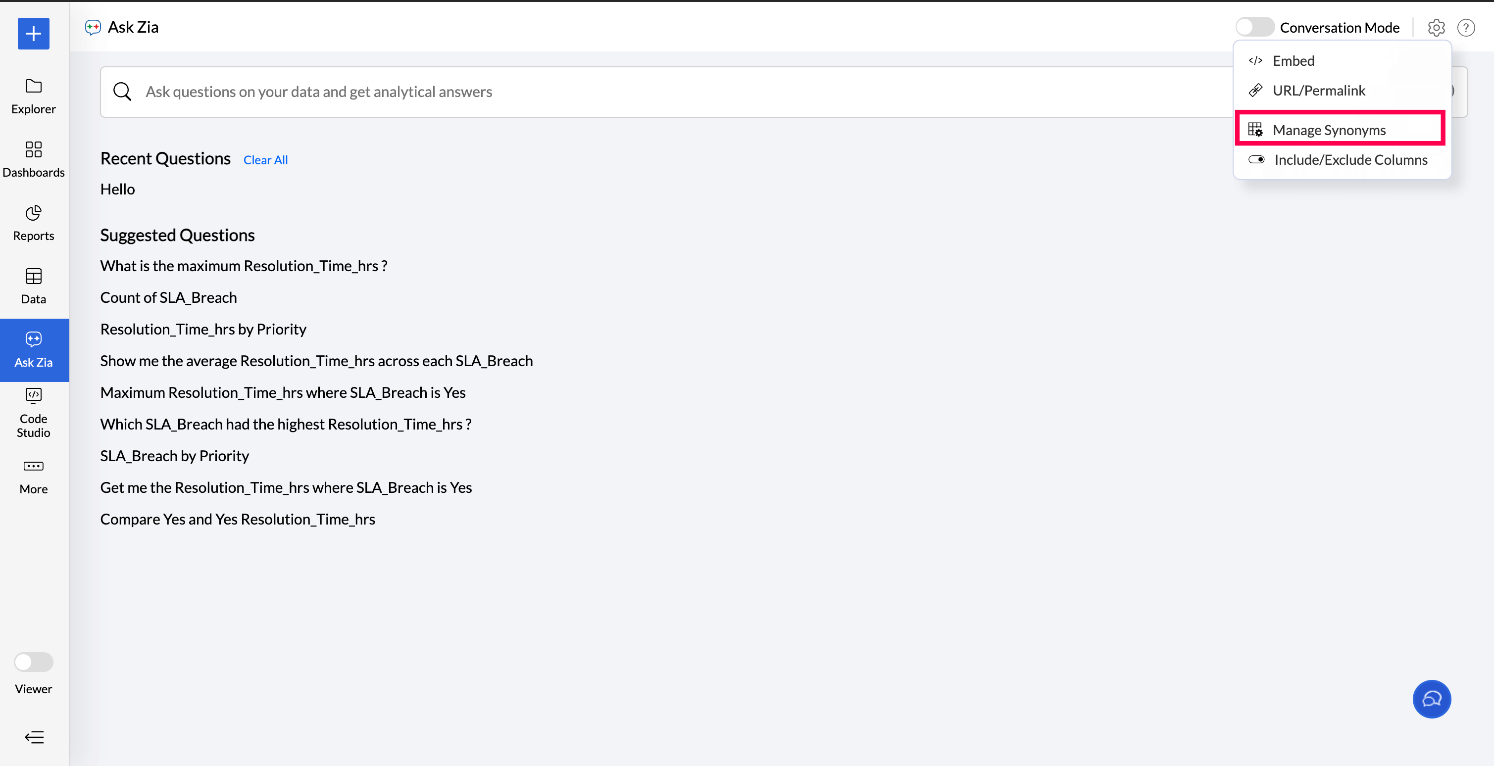 To access the Synonyms section, navigate to the Ask Zia page and click Settings > Manage Synonyms.